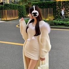 | 선호랭킹-25 스노우 페어리화이트 드레스 여성 리얼 타조 모피 칼라 후드 하단 니트 힙 스커트 흰색원피스